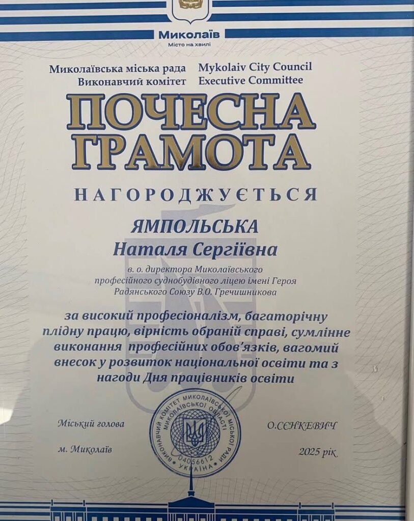 Колектив ліцею сердечно вітає в.о.директора Ямпольську Наталю Сергіївну з отриманням почесної грамоти Миколаївської міської ради! Шановна Наталю Сергіївно! Ця нагорода є яскравим і заслуженим свідченням Вашого високого професіоналізму, відданості справі та значного внеску в розвиток нашого ліцею! Бажаємо Вам міцного здоров’я, невичерпної енергії, оптимізму та нових визначних перемог на професійній ниві! Нехай кожен Ваш день буде наповнений радістю від успішно реалізованих планів! З повагою та найкращими побажаннями, Ваш педагогічний колектив